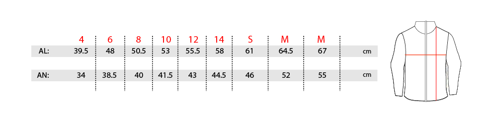 *AL: MESURA DES DE LA COSTURA DE LA PART SUPERIOR (Clavícula) FINS A LA COSTURA DE LA PART INFERIOR.